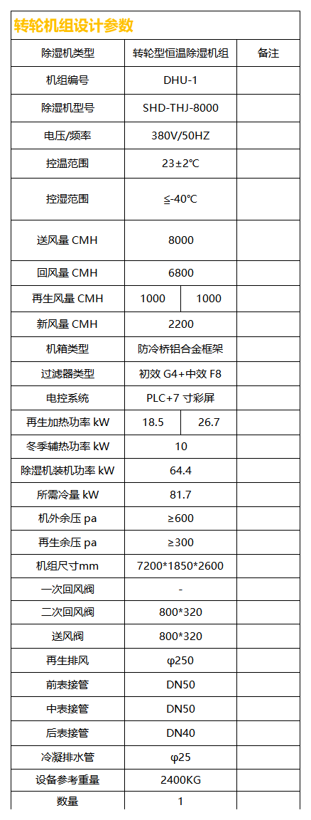 ①、轉輪除濕機組轉輪采用中高溫再生轉輪,其再生溫度在 80℃-120℃時可穩定運行,這比傳統的轉輪再生溫度 100℃-140℃低了 20℃,降低能耗的同時也增加轉輪的使用壽命。