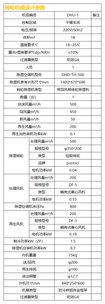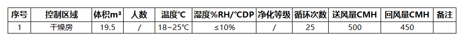 本方案除濕區(qū)域含:干燥區(qū)一個,基于甲供參數(shù)表及設(shè)計選型依據(jù),該區(qū)域采用一臺送風(fēng)量500CMH單轉(zhuǎn)輪除濕機(jī)組控制。
