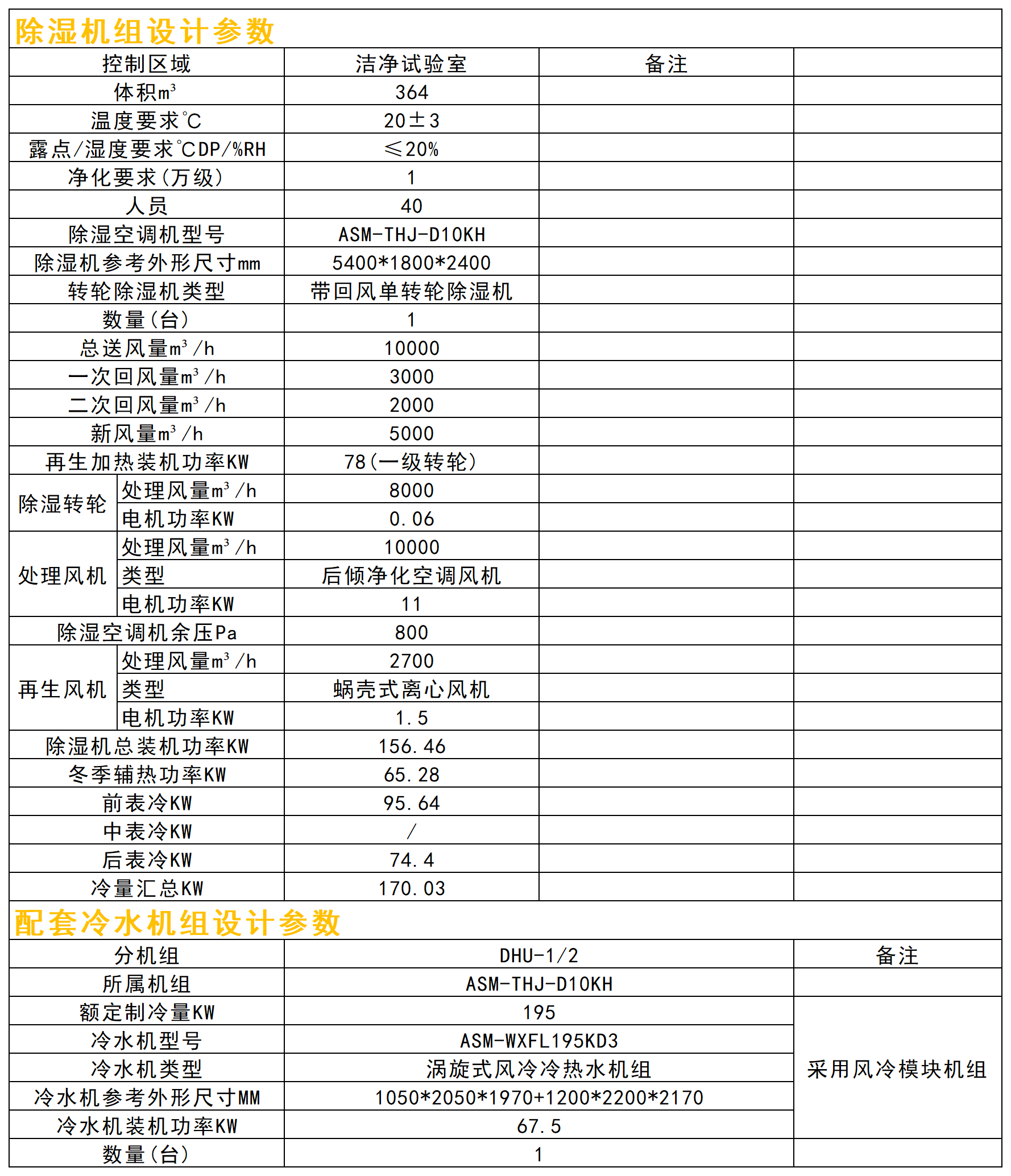 本方案除濕區域含:潔凈實驗室,基于甲供參數表及設計選型依據,設計1臺送風量10000CMH,回風量5000CMH的單轉輪除濕機組控制。