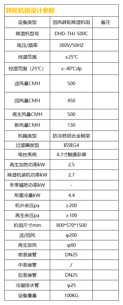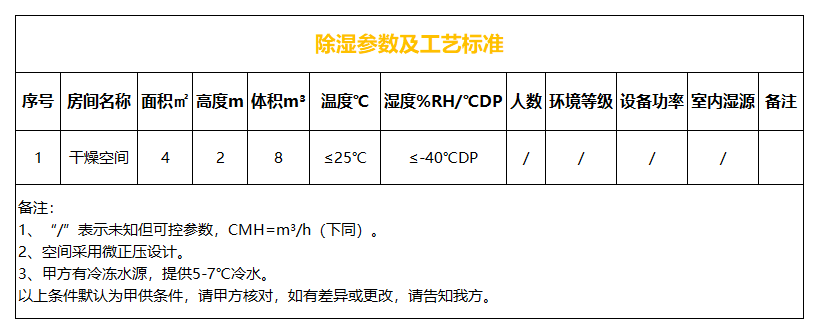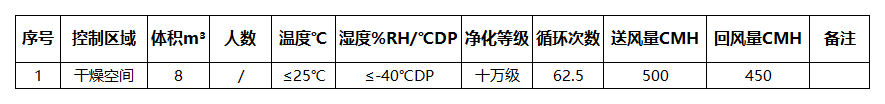 本方案除濕區域含:干燥空間一個區域,基于甲供參數表及設計選型依據,該方案采用一臺超低露點單轉輪C型除濕機組控制;