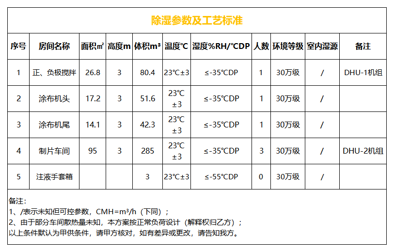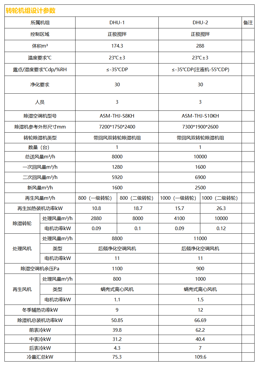 除濕DHU-1區域含:正極、負極攪拌、涂布機頭、涂布機尾、三個區域,基于1.1甲供參數表及1.2設計選型依據及甲供資料,此除濕區域采用一臺送風量8000CMH,回風量7200CMH,送風露點-65℃DP雙轉輪除濕機組控制;