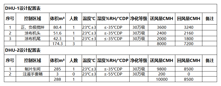 除濕DHU-2區域含:制片車間、注液手套箱兩個區域,基于1.1甲供參數表及1.2設計選型依據及甲供資料,此除濕區域采用一臺送風量10000CMH,回風量8500CMH,送風露點-65℃DP雙轉輪除濕機組控制;