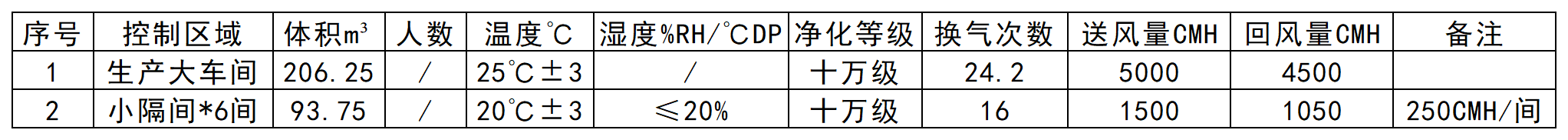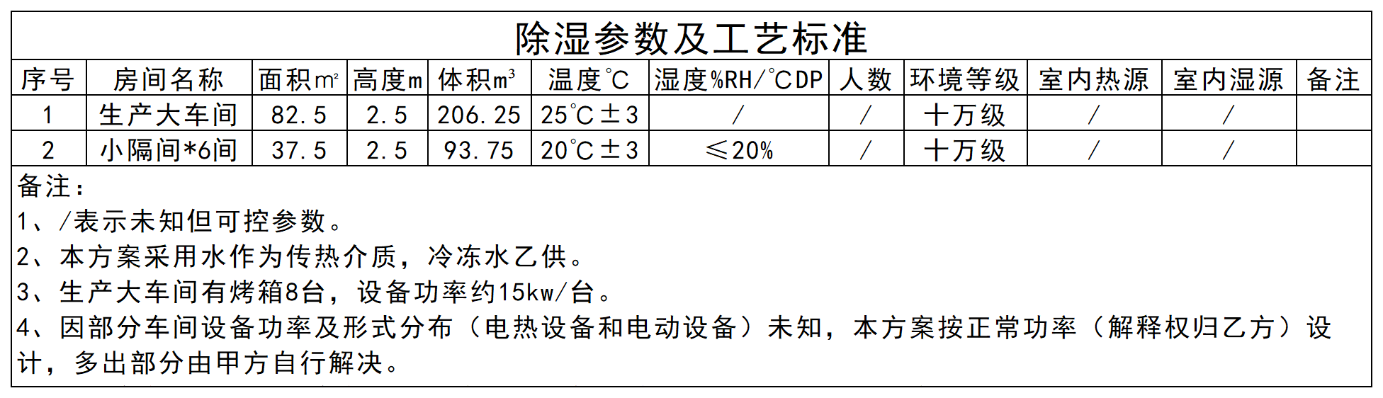 本方案除濕區域含:電子生產大車間及內部小隔間6個,基于甲供參數表及設計選型依據,其中小隔間總體積93.75m3,溫度要求20℃±3,濕度≤20%,除濕區域采用一臺送風量1500CMH,回風量1050CMH的單轉輪除濕機組控制;其中生產大車間體積206.25m3,溫度要求25℃±3,域內有15kw烤箱8臺,散熱量按設備功率的20%計算,除濕區域采用一臺送風量5000CMH,回風量4500CMH潔凈型空調風柜控制。