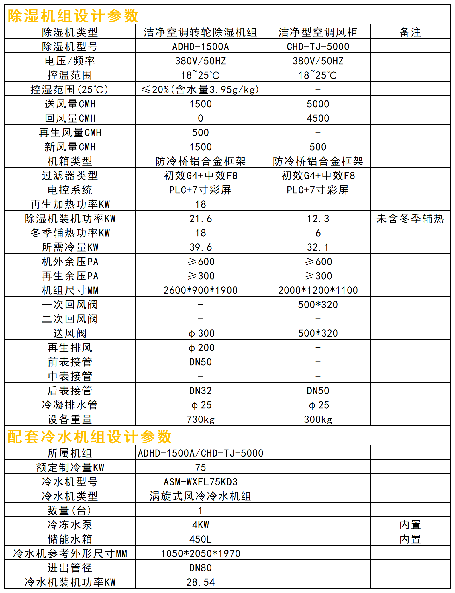 本方案除濕區(qū)域含:電子生產大車間及內部小隔間6個,基于甲供參數表及設計選型依據,其中小隔間總體積93.75m3,溫度要求20℃±3,濕度≤20%,除濕區(qū)域采用一臺送風量1500CMH,回風量1050CMH的單轉輪除濕機組控制;其中生產大車間體積206.25m3,溫度要求25℃±3,域內有15kw烤箱8臺,散熱量按設備功率的20%計算,除濕區(qū)域采用一臺送風量5000CMH,回風量4500CMH潔凈型空調風柜控制。