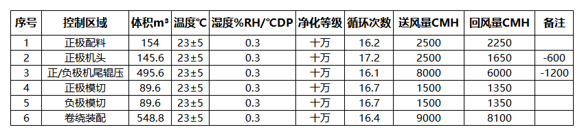 本項目含除濕區(qū)域干燥房和投料房,機(jī)組風(fēng)量需同時滿足域內(nèi)除濕,降溫,潔凈要求,三者取最大值為機(jī)組送風(fēng)量;房間無大型散熱設(shè)備,換氣按 16 次設(shè)計,新風(fēng)量取 10%,機(jī)頭機(jī)尾吸風(fēng)按600CMH/口計算。