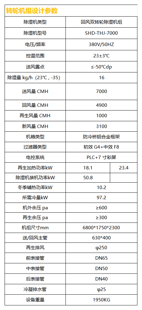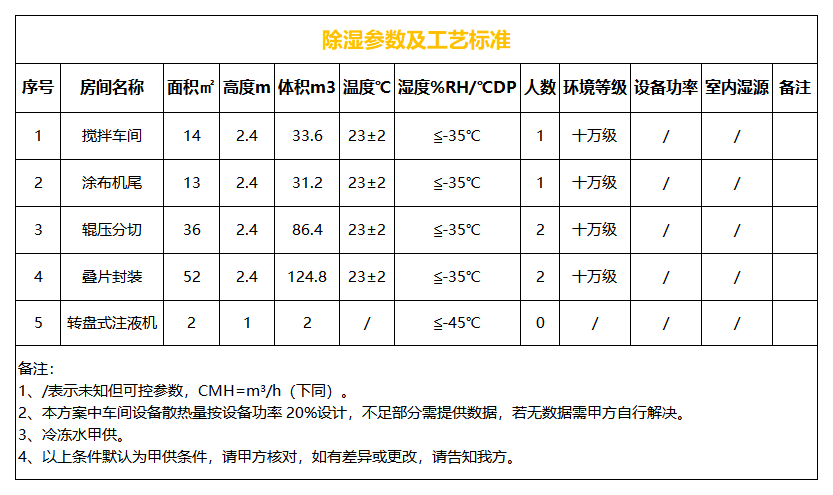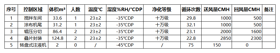 本方案除濕區域含:攪拌車間,涂布機尾,輥壓分切,疊片封裝,轉盤式注液機 5 個區域,基于甲供參數表及設計選型依據,其中攪拌車間,涂布機尾,輥壓分切,疊片封裝域內要求23℃ , 露點-35℃DP(含濕量 0.197g/kg 干),轉盤式注液機露點-45℃DP(含濕量 0.07g/kg 干),可采用一臺送風量 7000CMH,送風露點≤-50℃DP(含濕量 0.007g/kg 干 )雙轉輪機組控制;室內散濕量 H1=100*6=600g,室內除濕量 H2=7000*1.2* (0.197-0.007)=1596g,除濕量 H2>散濕量 H1*1.2(安全系數),所以該機組可以滿足區域除濕要求。