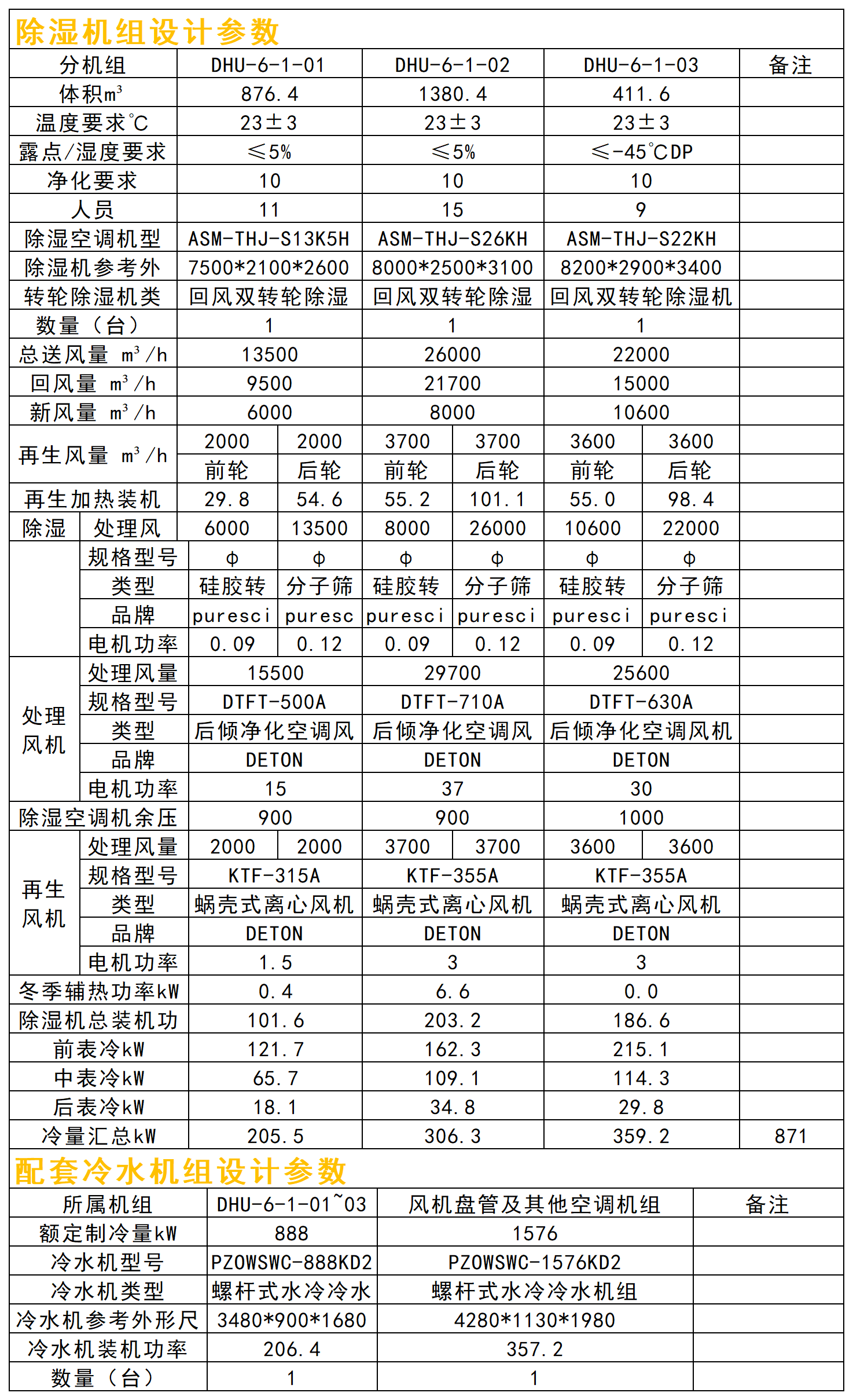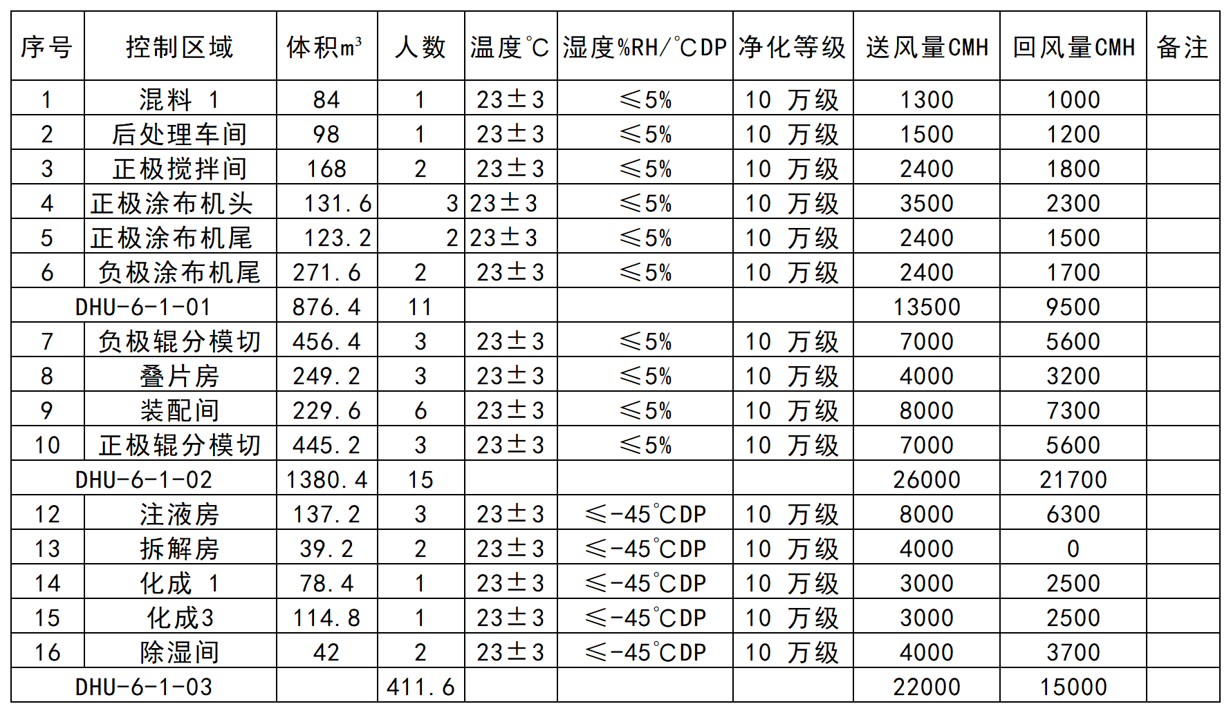 本方案除濕區域含:混料 1、后處理車間、正極攪拌間、正極涂布機頭、正極涂布機尾、負極涂布機尾、負極輥分模切、疊片房、裝配間、正極輥分模切、注液房、拆解房、化成 1、化成3、除濕間 15 個除濕區域;房間要求潔凈等級 10 萬級,所以房間所需換氣次數應不小于15 次,基于甲供參數表及設計選型依據,本除濕方案分三臺雙轉輪機組控制。